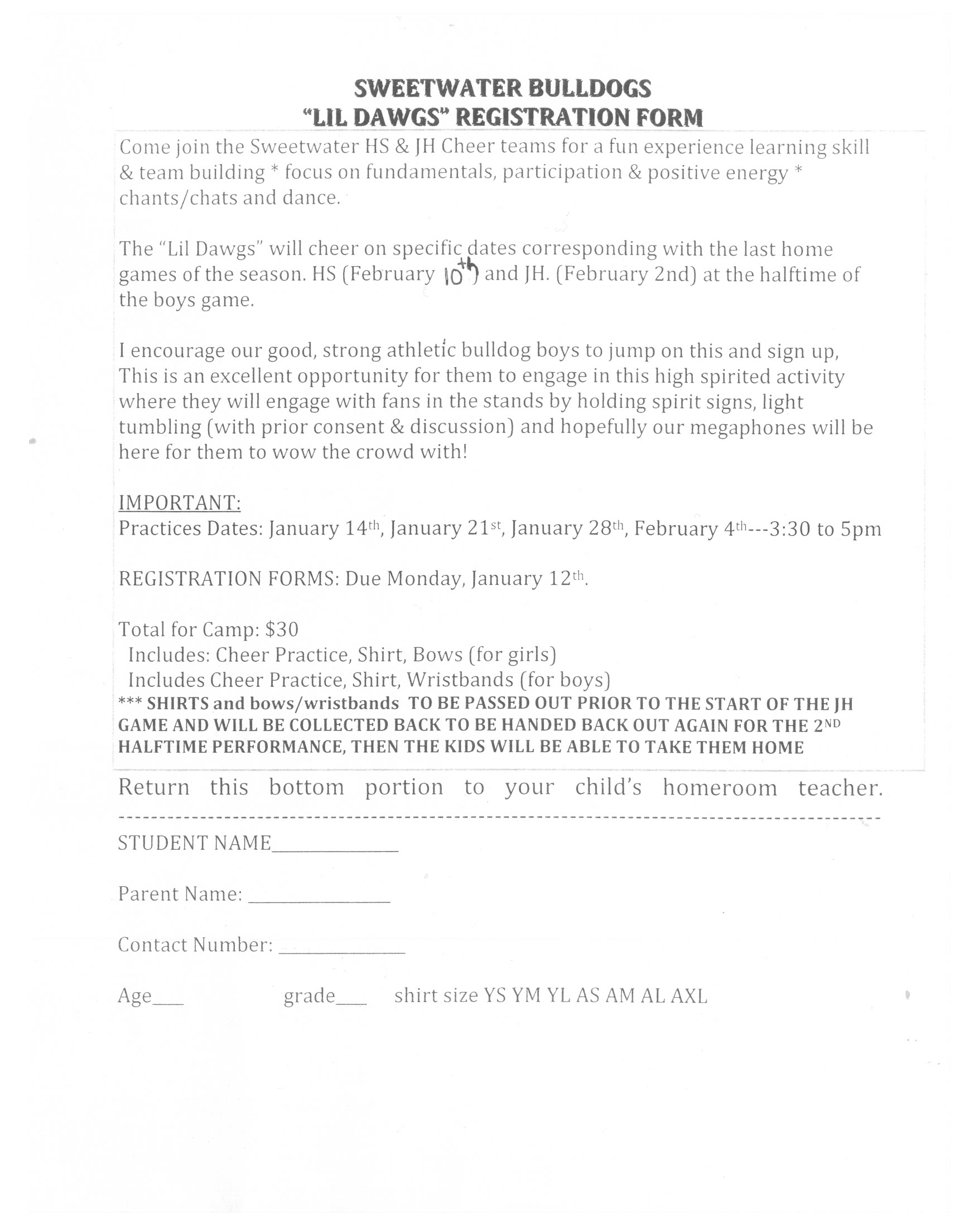 Reminder that Lil Dawg Cheer forms are due Monday. Questions? Call Ashley Megli 580.243.8375