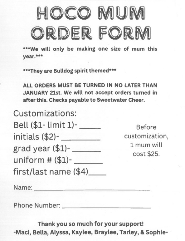 Money needs to be turned into one of the Jh/Hs cheerleaders or to Mrs. Megli.